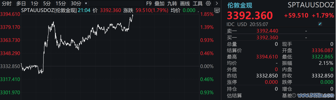 消息发布后,现货黄金短线拉升,一度突破3390美元关口。