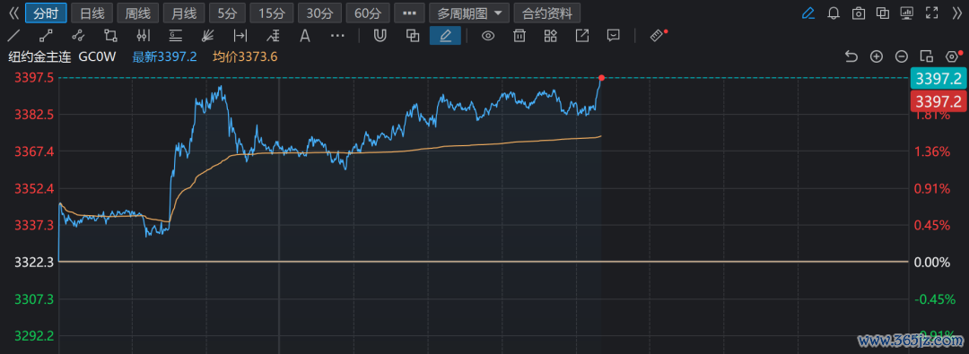 COMEX黄金期货主力合约也明显拉升,冲击3400美元关口。