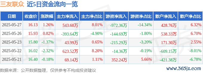 5月27日的资金流向数据方面,主力资金净流入543.6万元,占总成交额8.01%,游资资金净流出972.36万元,占总成交额14.34%,散户资金净流入428.76万元,占总成交额6.32%。
