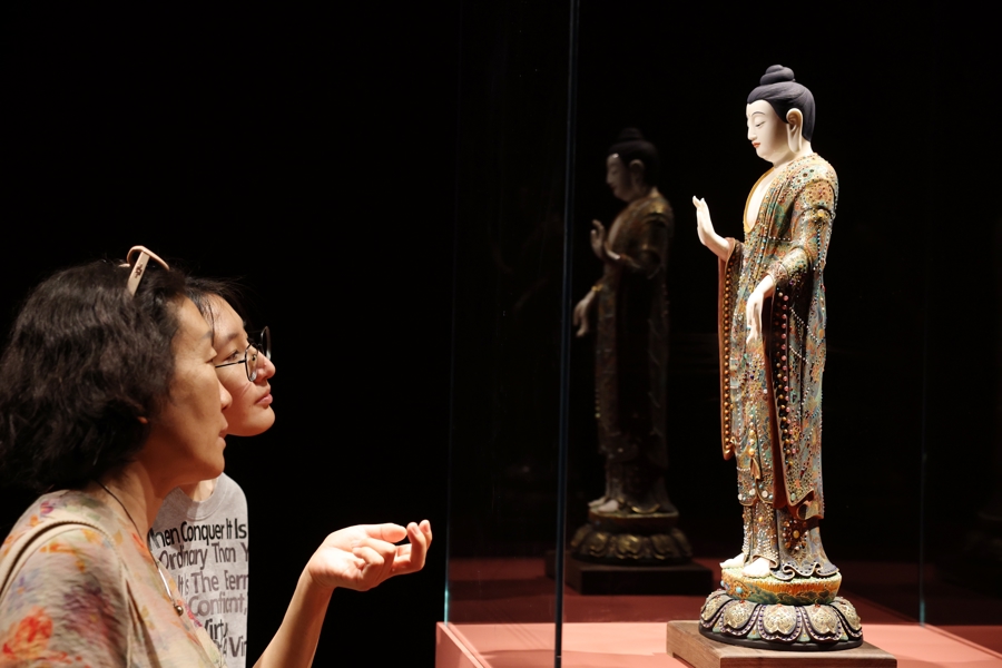 观众在欣赏连紫华《极彩·如愿多宝佛》。