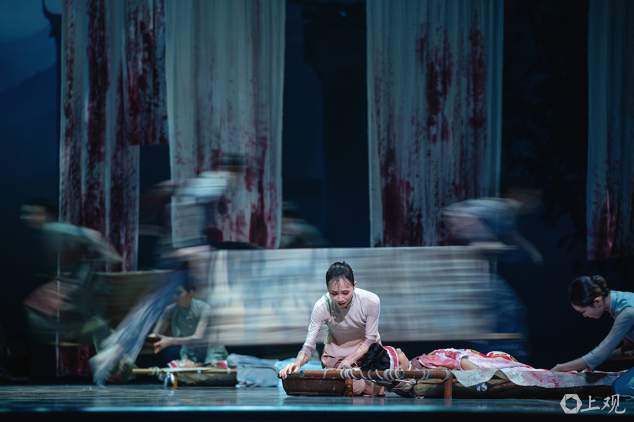 首席主要演员戚冰雪饰演的新媳妇将美丽娴静、淳朴善良的江南女子特质展现得淋漓尽致。为平衡芭蕾的挺拔与中国舞蹈的柔和曲线,她在播种、织布等生活化动作中寻找融合点,尤其在为通讯员擦拭身子的段落,手臂动作既保留芭蕾的优雅,又传递出庄严与虔诚。